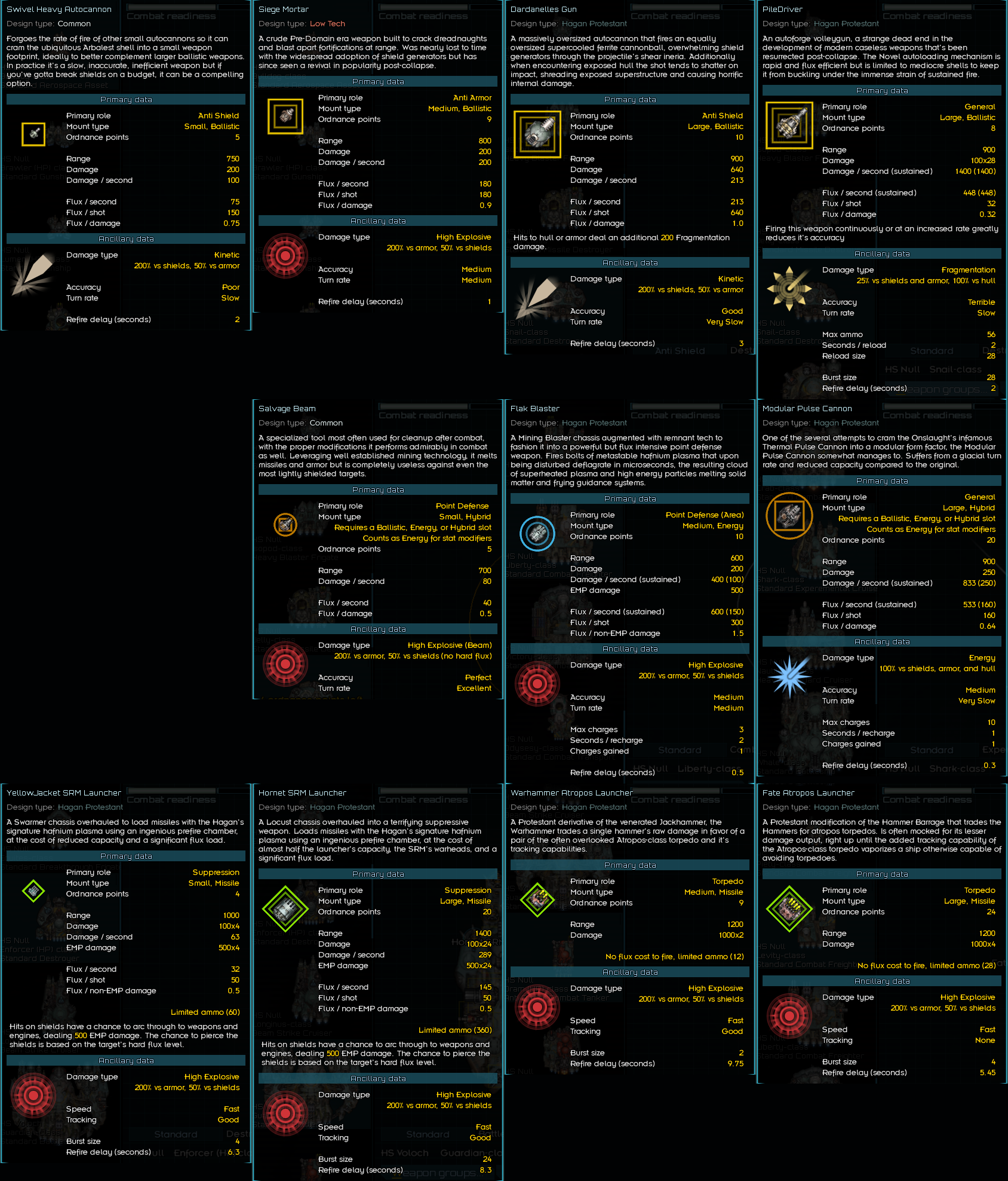 Are all those hundreds of "ship and weapon pack" on the forum/discord not enough for you? I got you covered my man. And here you'll see some ships and guess what? some weapons, especially a bunch of reloadable missiles that I really think is lacking in vanilla. Most of them are not so powerful (I hope) but they'll shine in longer engagements. I'm also adding weapons to fill the range gap that is huge in vanilla. There's a bunch of 900su mediums and 1000su larges... changelog: