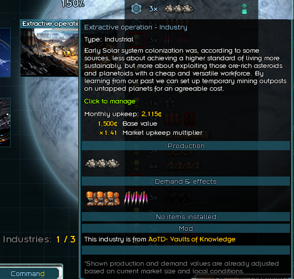 A cargo space compression utility mod that adds 6 new toggle abilities (Ore Refinery, Rare Ore Refinery, Bio Refinery ,Volatiles Refinery, Fuel Compression and Food Compression) that refine resources found in mining stations, orbital habitats or from the Nexerelin mod mining feature by using heavy machinery and forges them into custom manufactured commodities that take up less space.