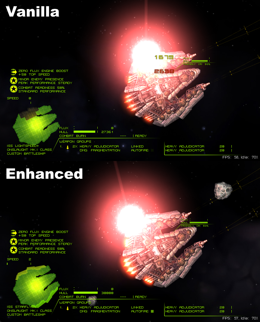 GraphicsLib is a mod package containing numerous graphical improvements, including a variety of effects plugins, a dynamic lighting engine, and a screen-space distortion shader. This library can also be used by other modders to implement unique shaders and make use of the built-in lighting, distortion, and post-processing APIs.